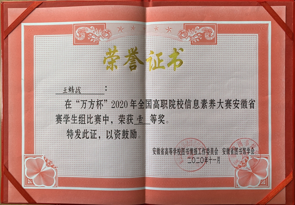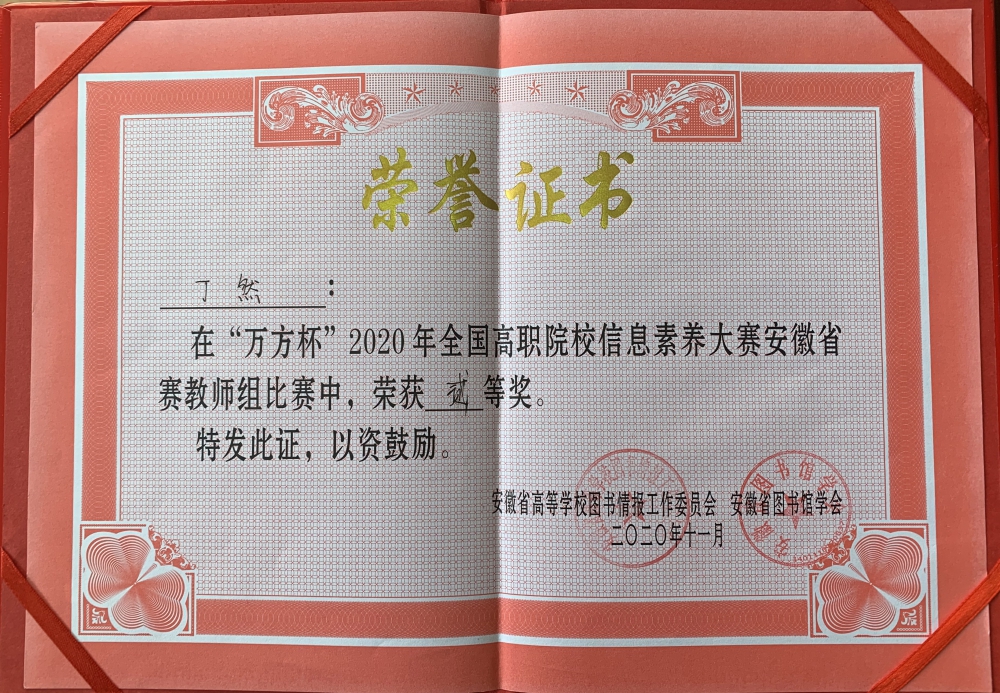 11月6日,“万方杯”2020年全国高职院校信息素养大赛安徽省选拔赛圆满落下帷幕,我院图文信息中心积极响应图工委号召,以全面提升师生信息素养为目标,认真组织教师和学生备赛。在院领导支持和各系部通力配合下,学院师生在本次大赛中均取得了可喜的成绩。
