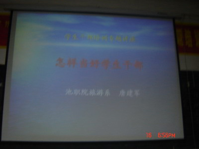 3月16 日晚7时,旅游系团总支、学生会在院阶梯教室二楼举办了一期学生干部培训讲座。本次讲座特邀系负责人唐建军同志主讲,他将管理理论与学生工作实践有机结合,生动地向干部同学们讲解了应如何加强自身修养,如何改进工作方法。