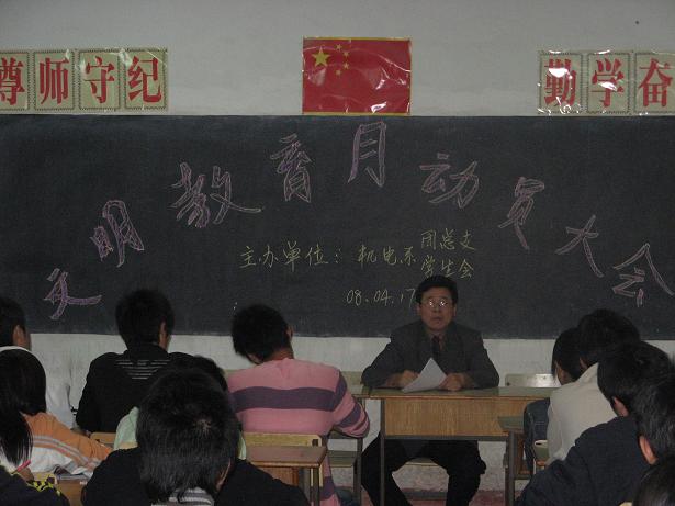 为确保文明教育月活动的顺利开展,机电系党支部书记马文申老师于二00八年四月十七日晚在06机制班主办了文明教育月活动动员大会,各班级学生干部参加了会议,会上马书记以幽默风趣的语言对我系同学存在的不文明行为进行了分析,针对《池州职业技术学院文明行为规范》作了详细的讲解。希望班级干部能起到带头作用,号召大家积极配合系团总支、学生会开展的各项文明教育活动。