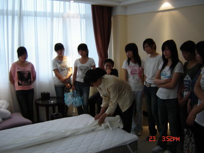 此次见习,将学生与带队教师划分为两大组作两轮进行,由宾馆领导引领师生们参加总台、客房、餐厅等部门,重点讲解餐饮服务岗位的工作要领并观摩规范的中餐摆台程序,还就同学们提出的各种问题一一做出解答。